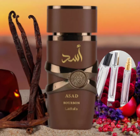 Asad Bourbon: For the man who knows what he wants. A bold and sophisticated fragrance where the sweetness of Mirabelle plum meets the warmth of pink pepper and the elegance of lavender. Rich spices and velvety cacao create an irresistible heart, while luxurious bourbon vanilla and amber leave an unforgettable trail of power and seduction.